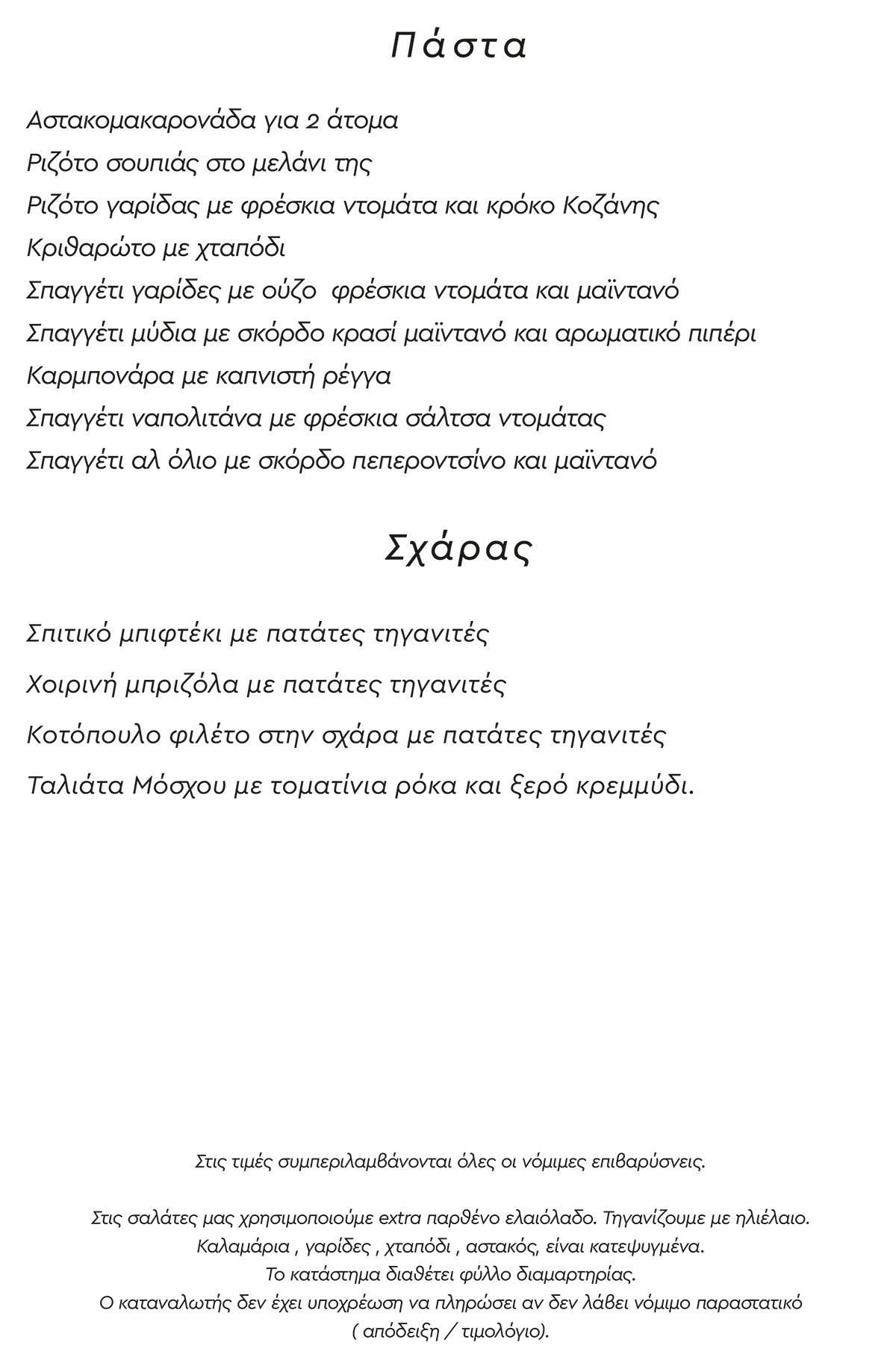 Για όσους δεν προτιμούν τα ψάρια διαθέτουμε όλα τα είδη των κρεατικών ψημένων στα κάρβουνα και μαγειρευτά φαγητά από την παραδοσιακή ελληνική κουζίνα.