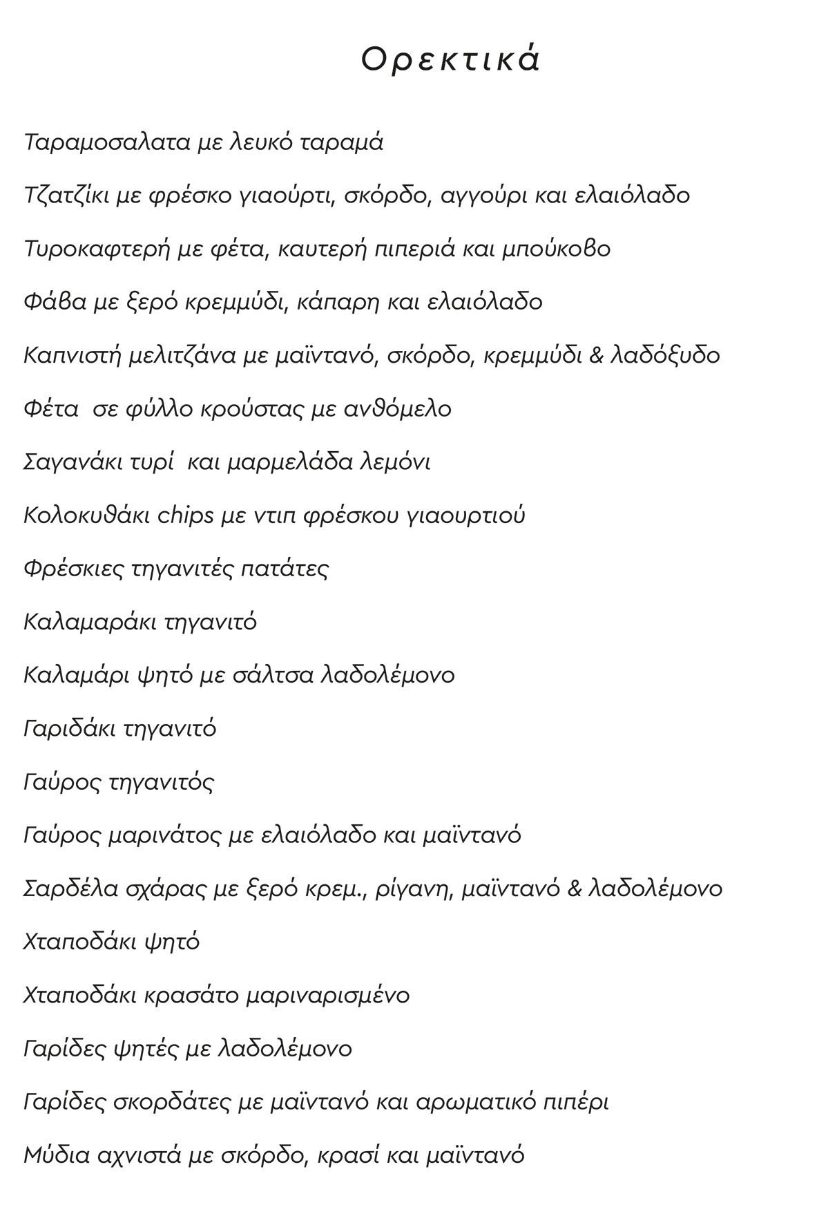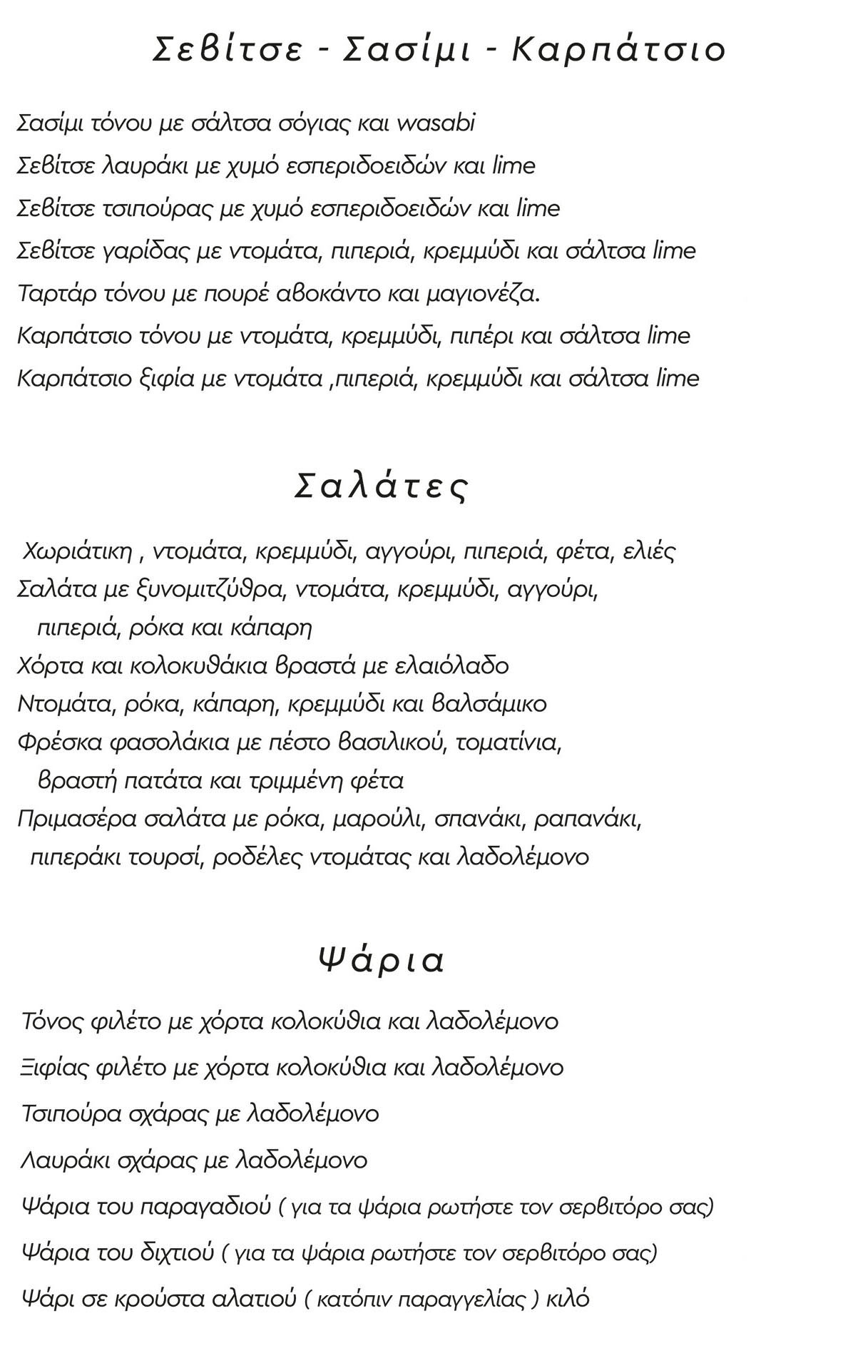 Για όσους πάλι θέλουν, συνοδεύστε τα καλοψημένα φρέσκα ψάρια από το μαριδάκι ή αθερίνα και σαρδέλα μέχρι τη σφυρίδα ή συναγρίδα με παγωμένο κρασί από τα βαρέλια μας και τους ψαρομεζέδες και τα ορεκτικά μας με ούζο ή τσίπουρο.